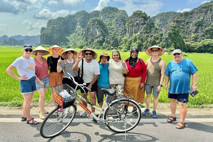 Discover Ninh Binh on a full-day trip from Hanoi with historic sites, a local lunch, a bamboo boat ride, and a scenic bike tour through peaceful villages and rice fields.